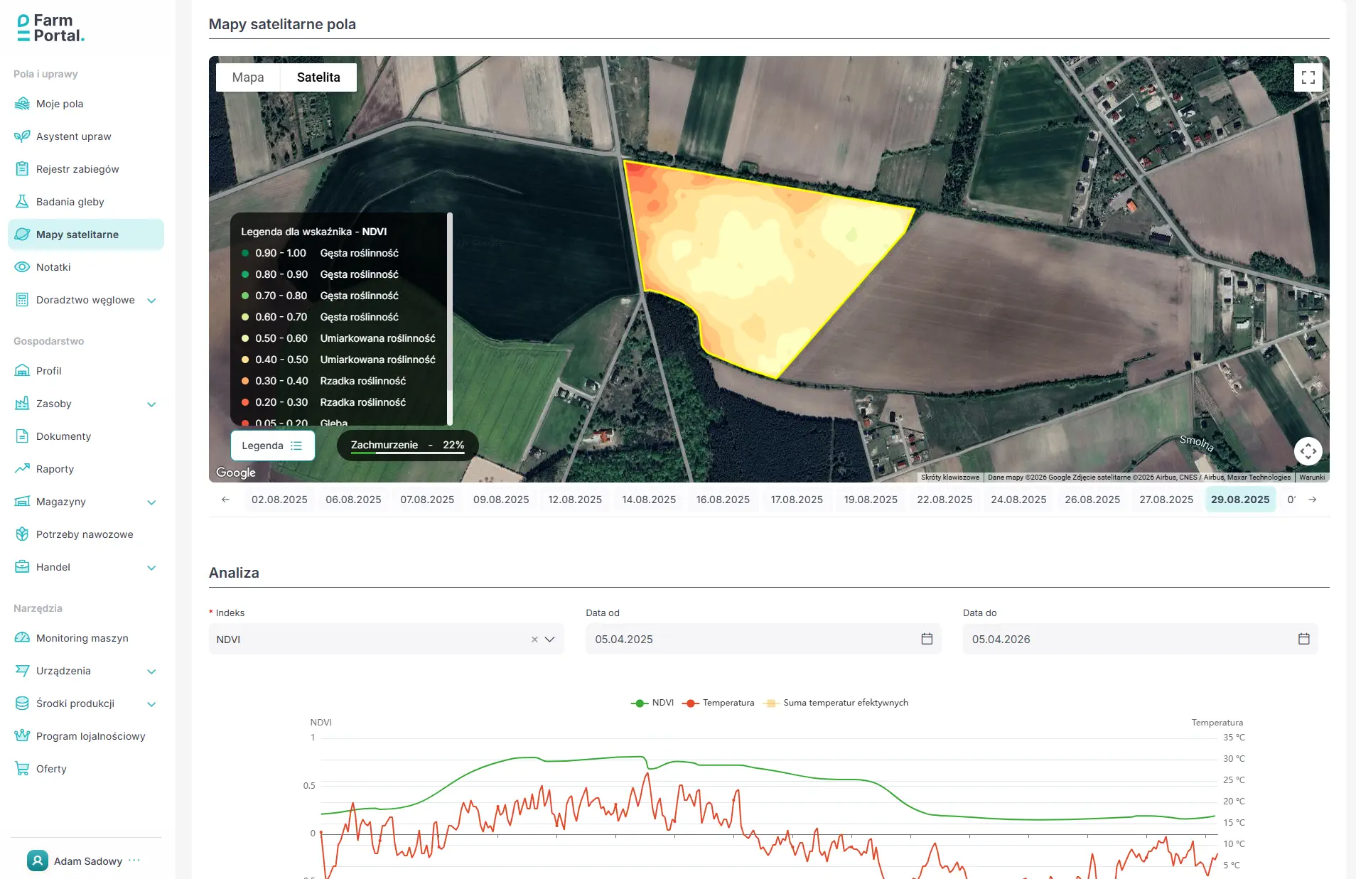 FarmPortal jako system zarządzania gospodarstwem łączy w jednym miejscu kalkulacje nawozowe opracowane z Uniwersytetem Przyrodniczym w Krakowie, mapy indeksów satelitarnych i eksport map aplikacyjnych do maszyn. Dzięki temu droga od próby glebowej do zabiegu VRA skraca się do kilku kliknięć.