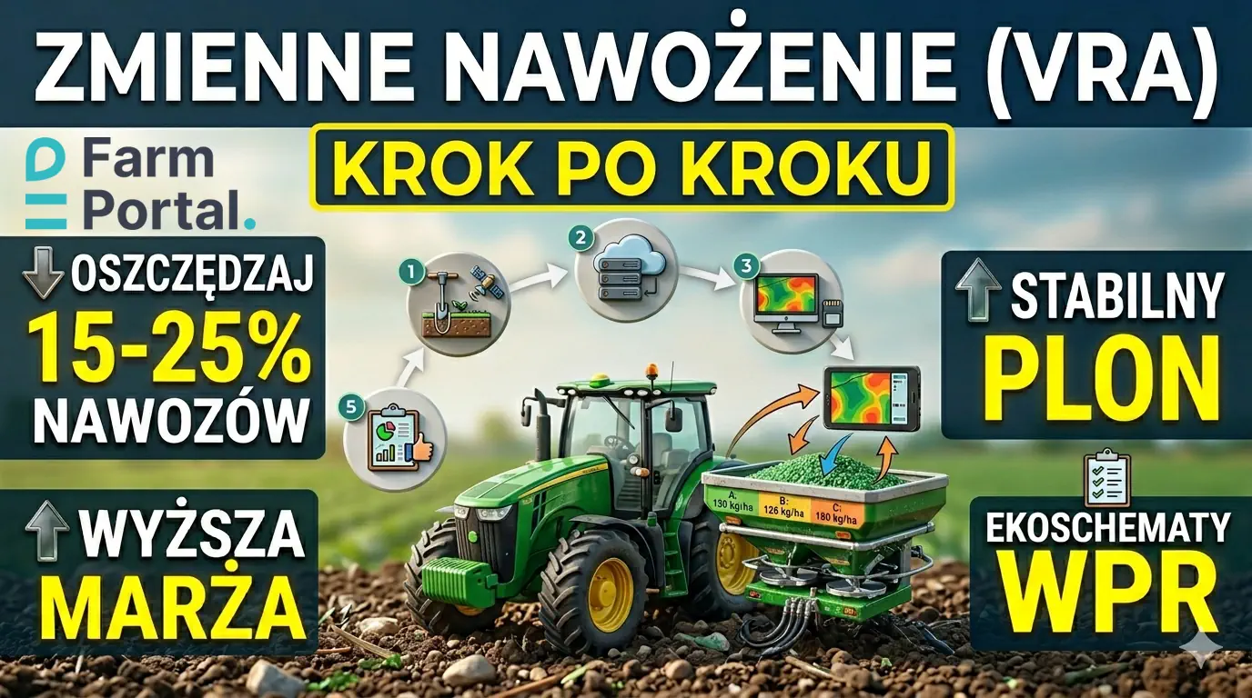 Zmienne nawożenie (ang. Variable Rate Application, VRA) to metoda precyzyjnego rolnictwa, która dostosowuje dawkę nawozu do aktualnej zasobności gleby i potrzeb roślin w każdym punkcie pola – zamiast stosować jedną średnią dawkę „na hektar". Technologia pozwala ograniczyć koszty nawozów o 10–25%, zmniejszyć ryzyko zanieczyszczenia wód azotanami i udokumentować praktyki środowiskowe wymagane przez ekoschematy WPR. Zgodnie z danymi USDA z 2023 r. aż 45% dużych gospodarstw na świecie stosuje już VRT. W Polsce wdrożenie przyspiesza – 80% pól jest przenawożonych w potas i fosfor (dane OSCHR), co oznacza, że potencjał oszczędności jest natychmiastowy i mierzalny.